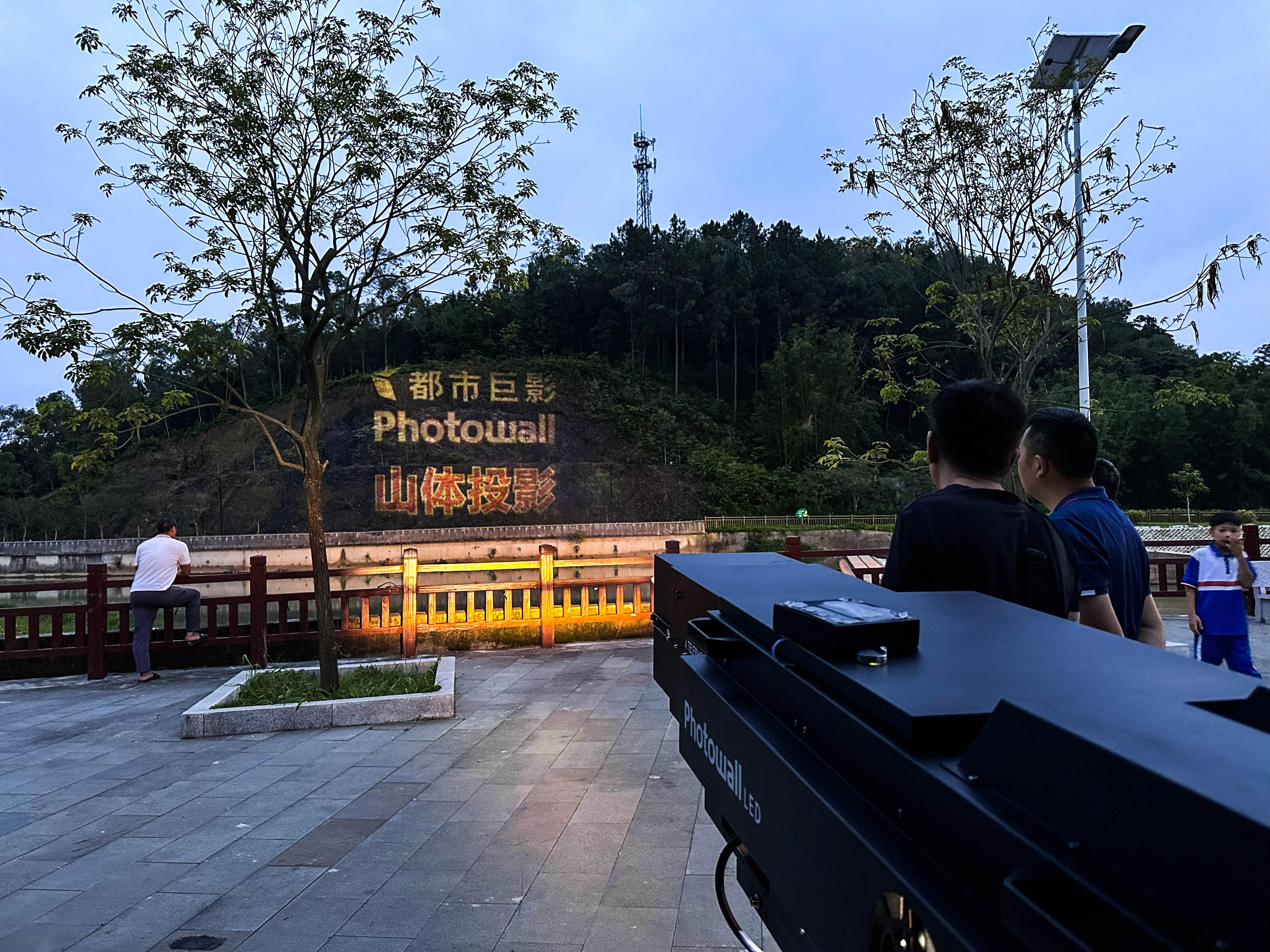 河坝旁山体亮化投影,投影距离90米,投影面积约25*25m